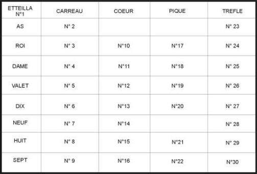 Cela fait, numéroter toutes les cartes restantes, le n° 1 étant la carte supplémentaire, vient ensuite le n° 2 (l’as de carreau), n° 3 (le roi de carreau), ...n°10 (le roi de cœur), ...n°17 (le roi de pique), ...n° 30 (le sept de trèfle, voir tableau).